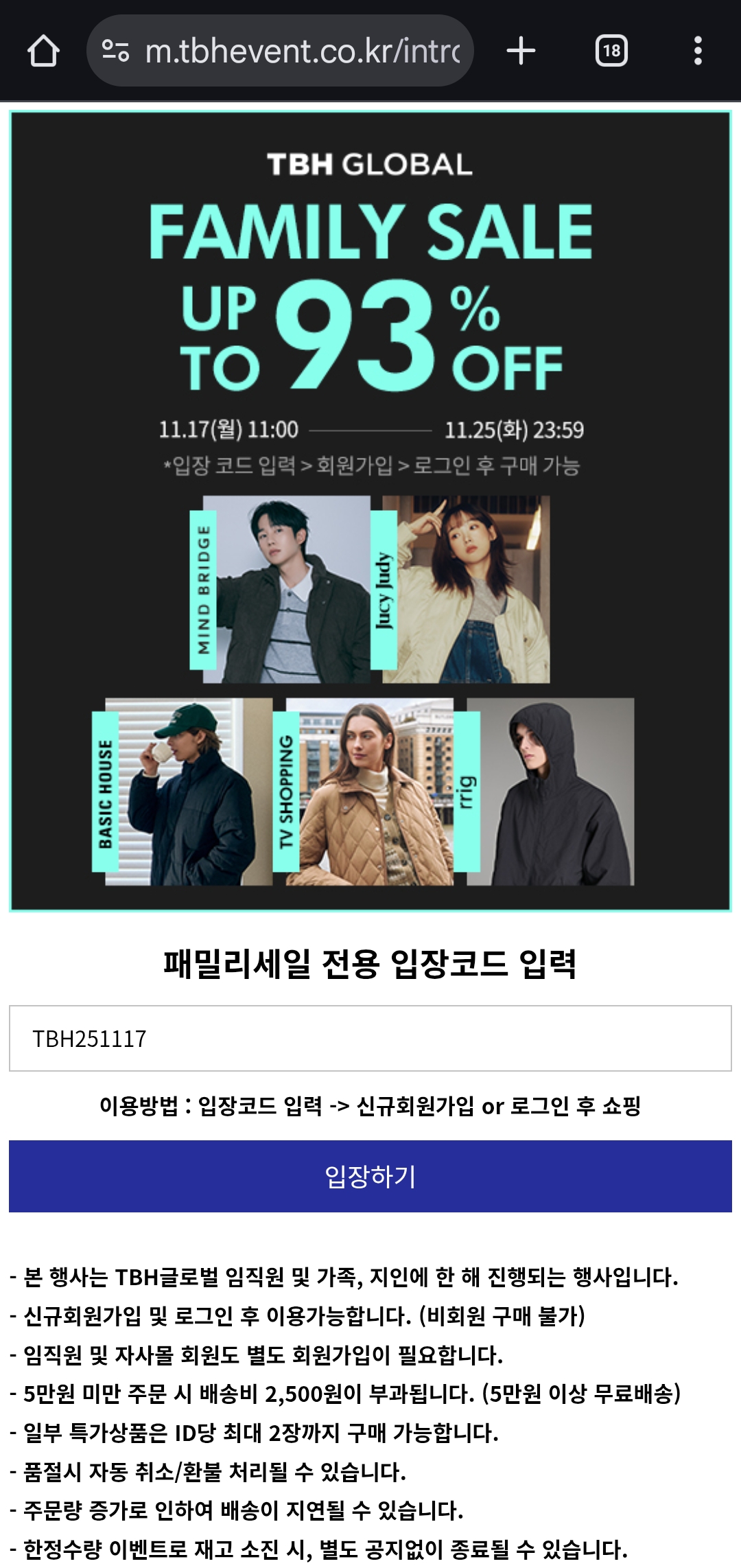 TBH글로벌 패밀리세일, 마인드브릿지 할인, 쥬시쥬디 세일, 베이직하우스 특가, 리그 rrig 할인, TBH251117, 패밀리세일 입장코드, 11월 패션 할인, 겨울 아우터 세일, 의류 최대 93% 할인