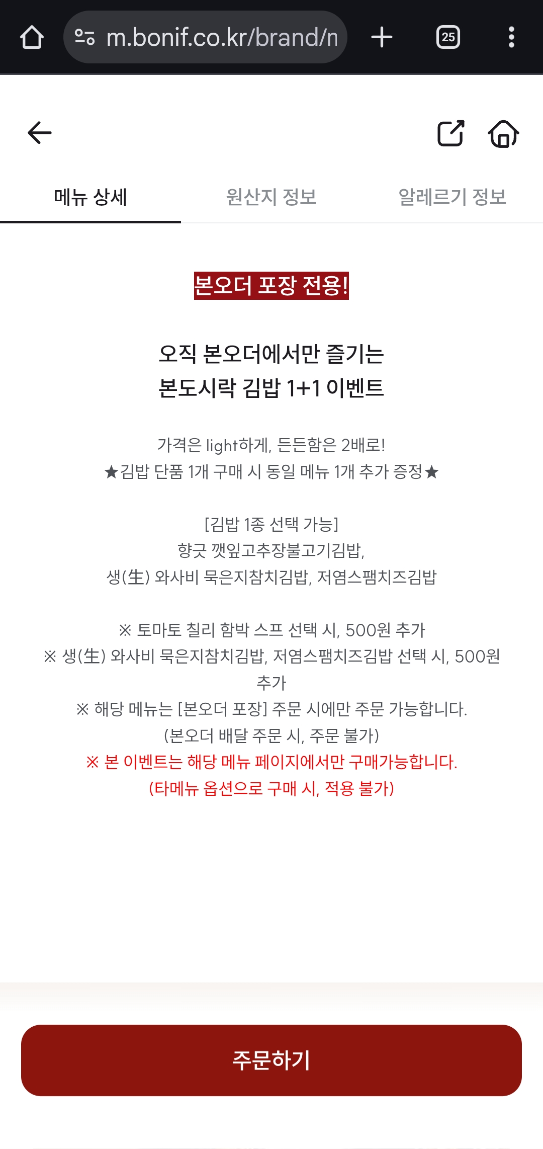 이번 김밥 1+1 이벤트는 본오더 포장 전용 메뉴입니다.