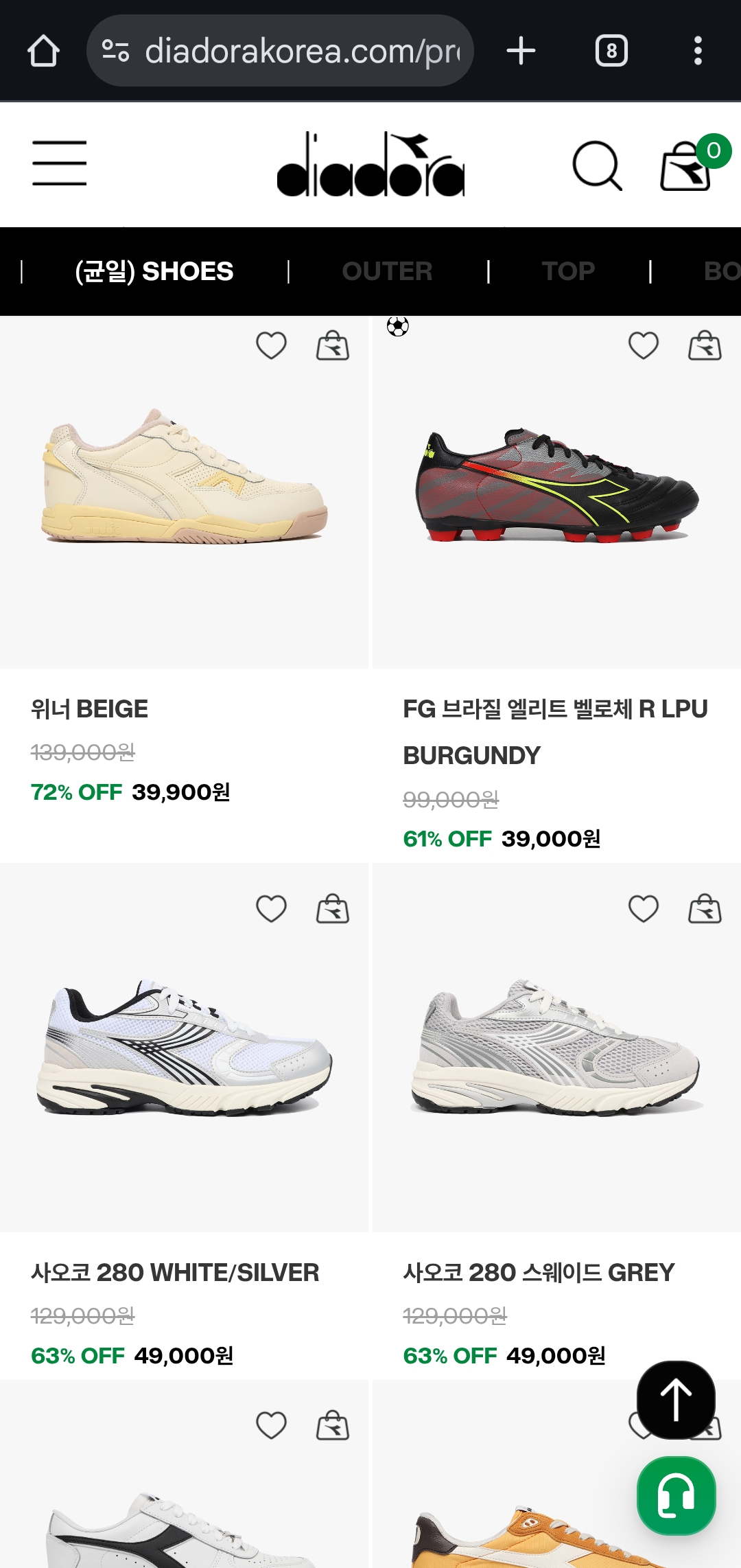 지금 디아도라코리아에서 그린 프라이데이를 맞아 아우터·스니커즈·집업 자켓 등 인기상품을 최대 75% 할인하고 있습니다.