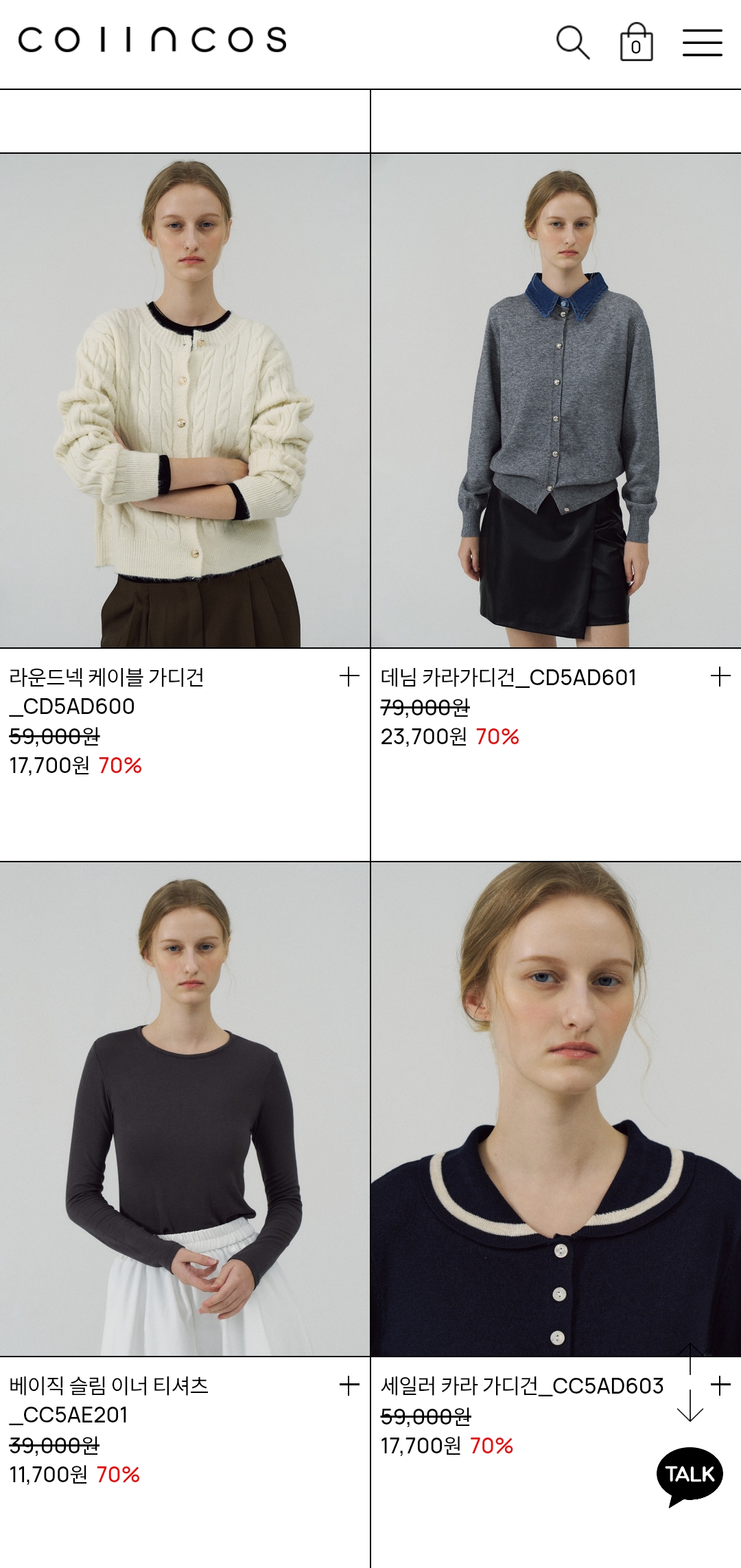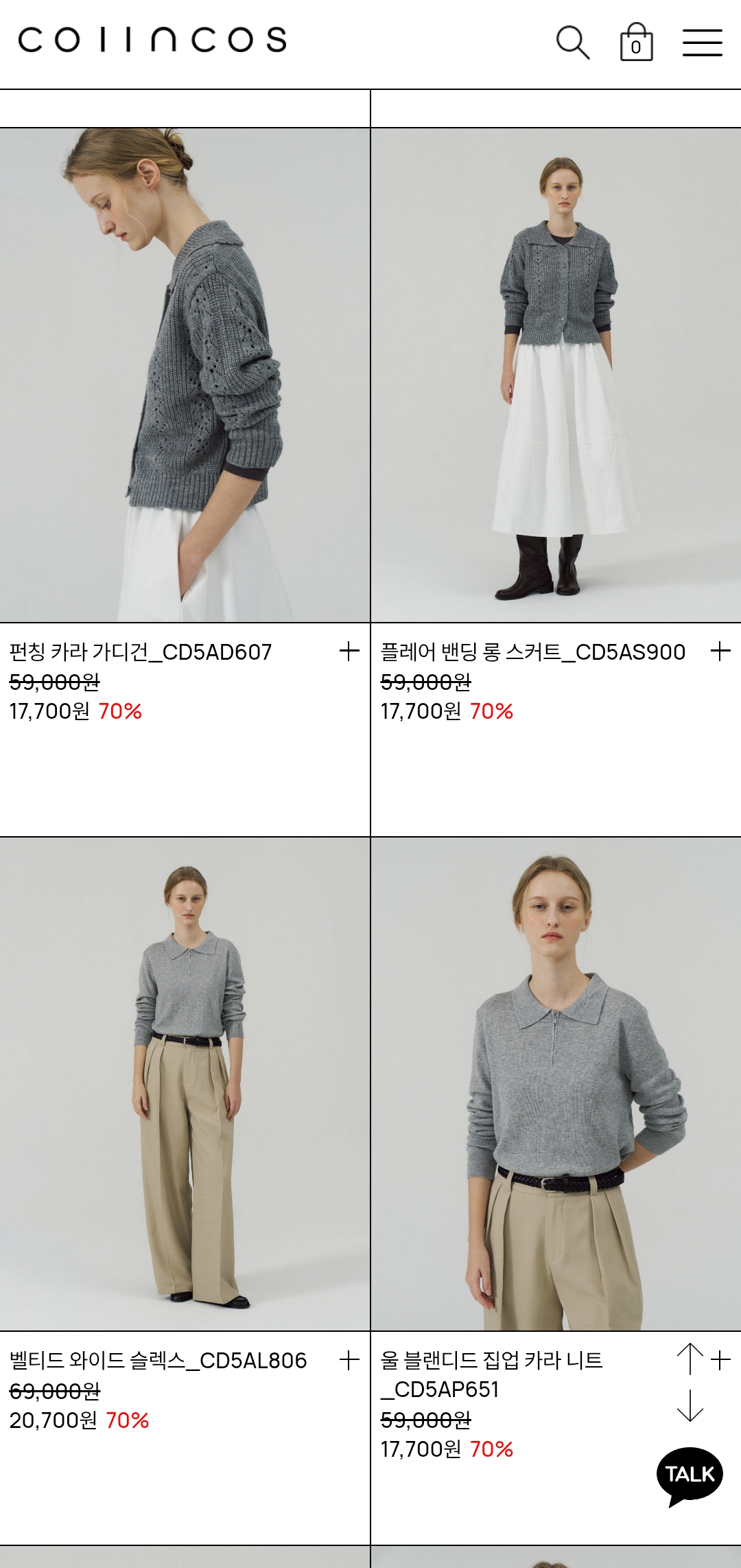 울 블랜디드 집업 카라 니트 (정가 59,000원 → 할인가 29,500원, “50%↓”)