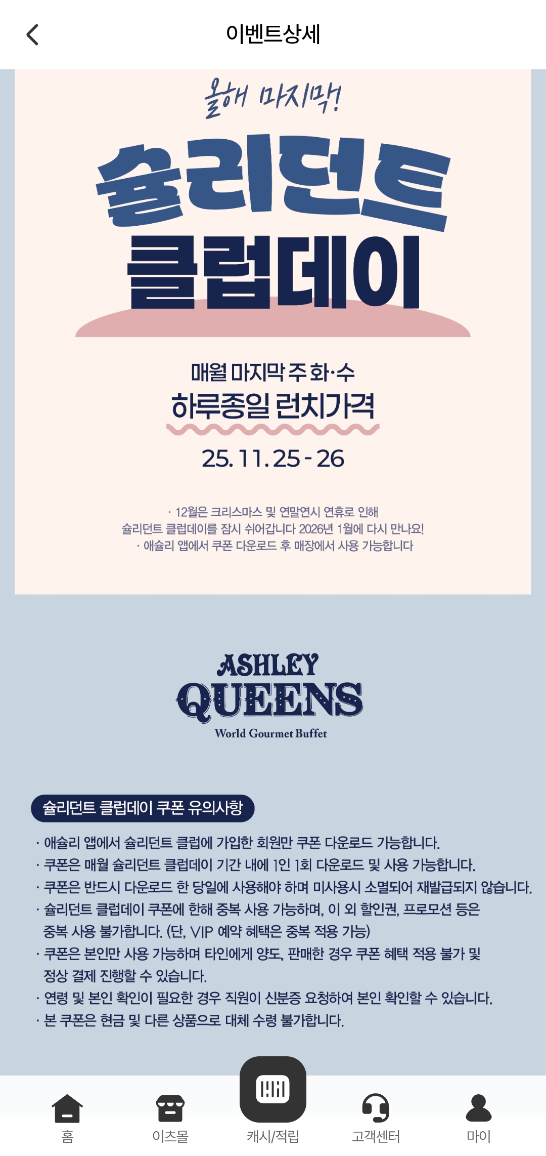 가입 방법: 애슐리 앱에서 ‘슐리던트 클럽’ 가입 → 쿠폰 다운로드 후 매장 사용 가능
