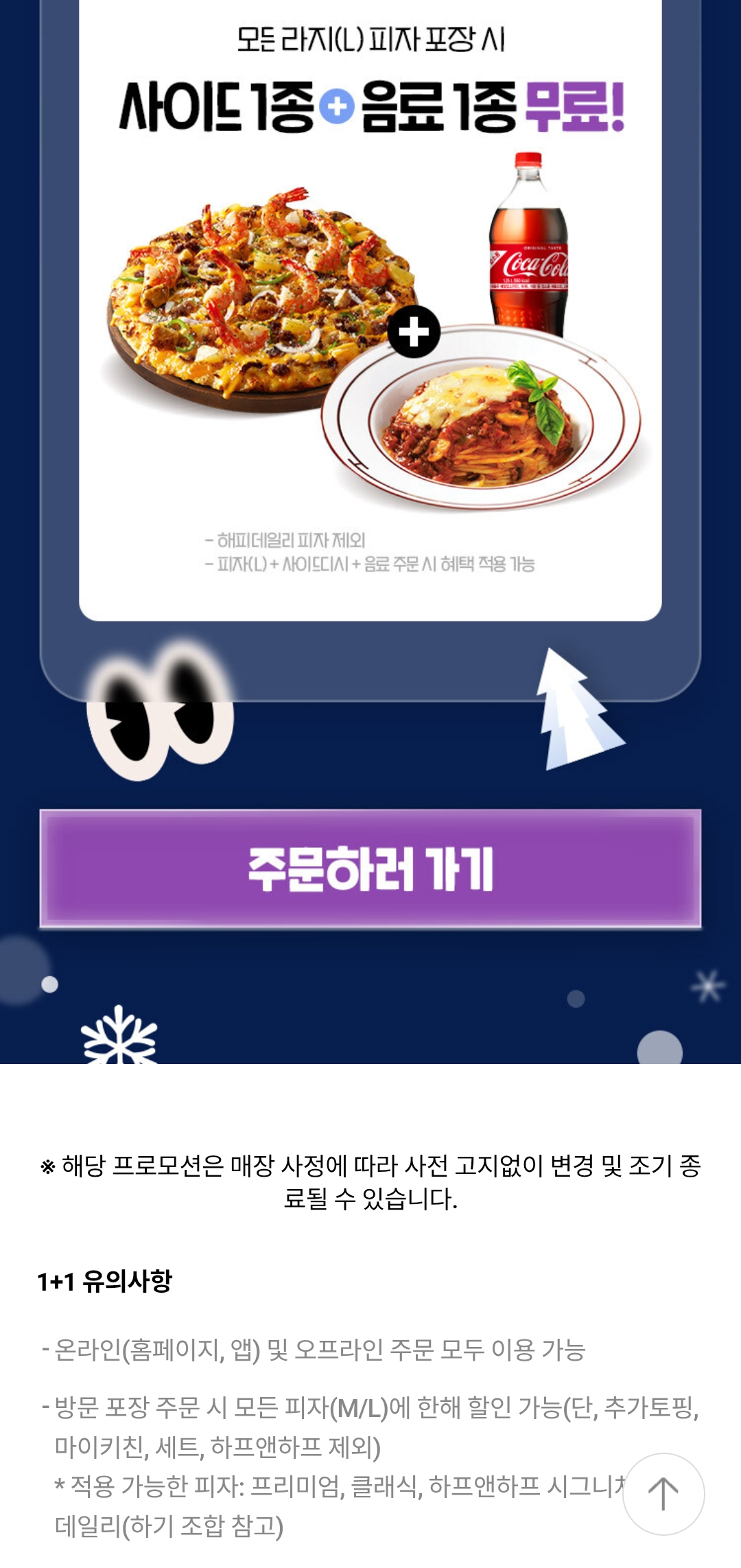 라지(L) 피자 포장 시 사이드 1종 + 콜라 1종 무료