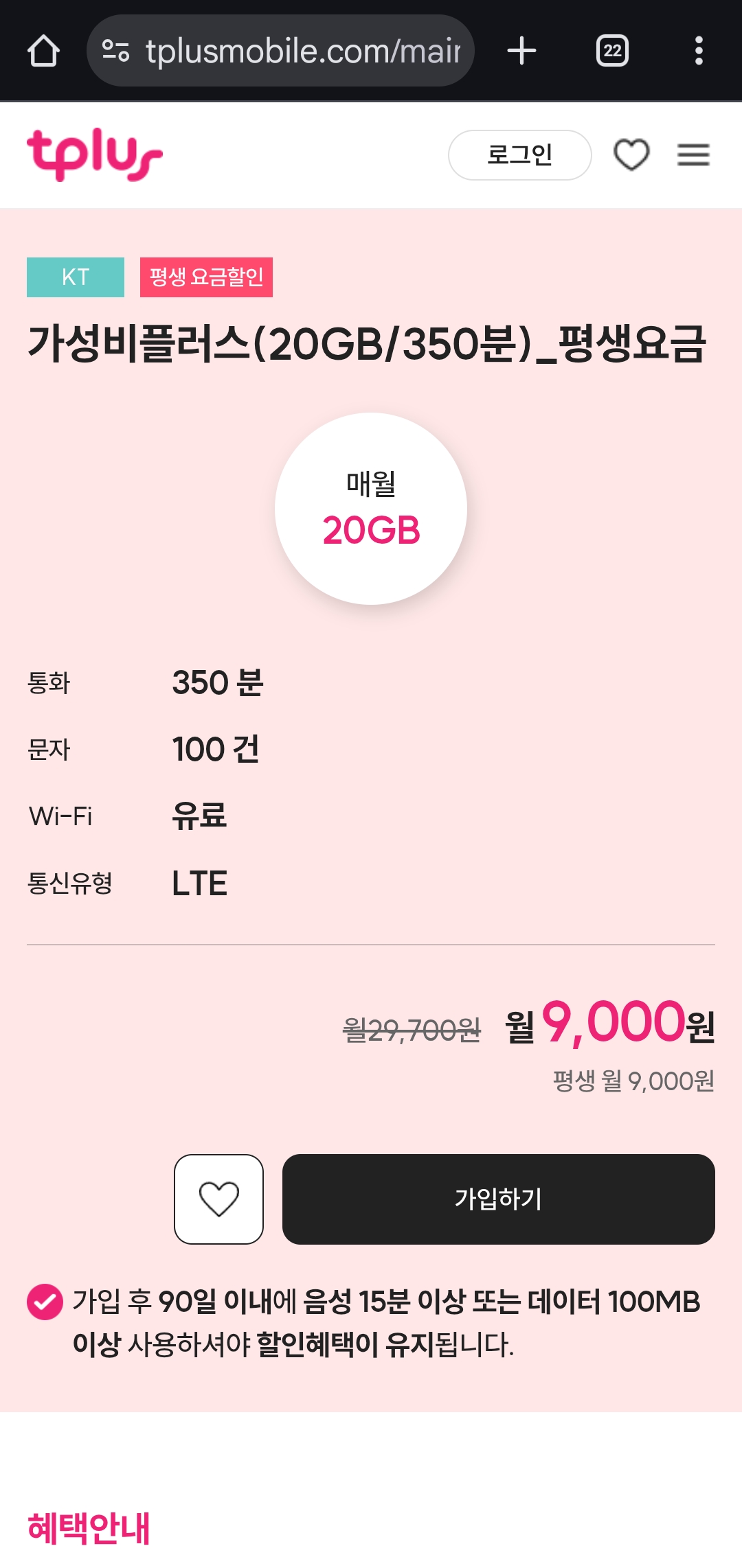 요금제명: 가성비플러스(20GB/350분)_평생요금