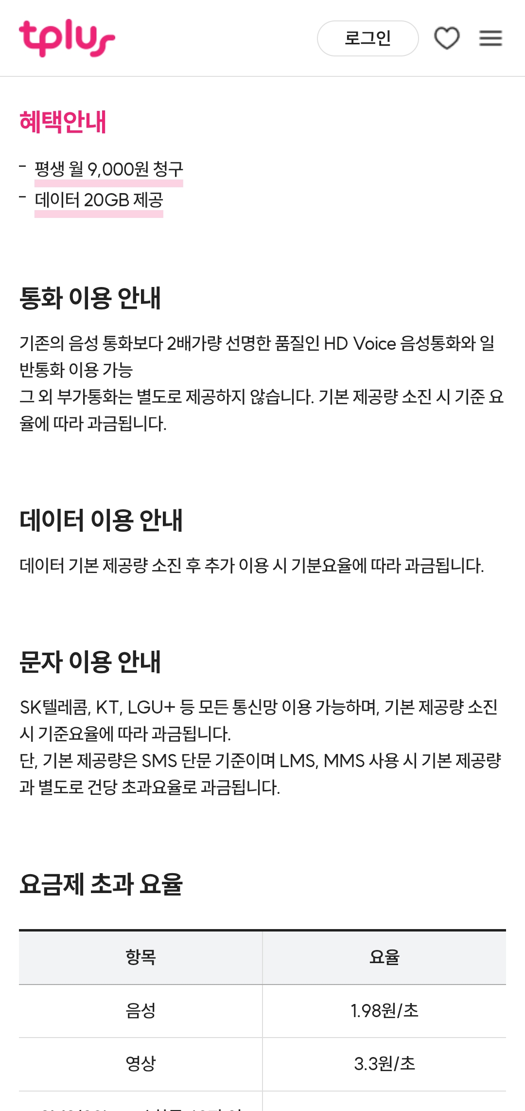 데이터 20GB + 통화 350분을 9,000원에 평생 고정으로 제공하는 티플러스 요금제가 가장 합리적인 선택지 중 하나입니다.