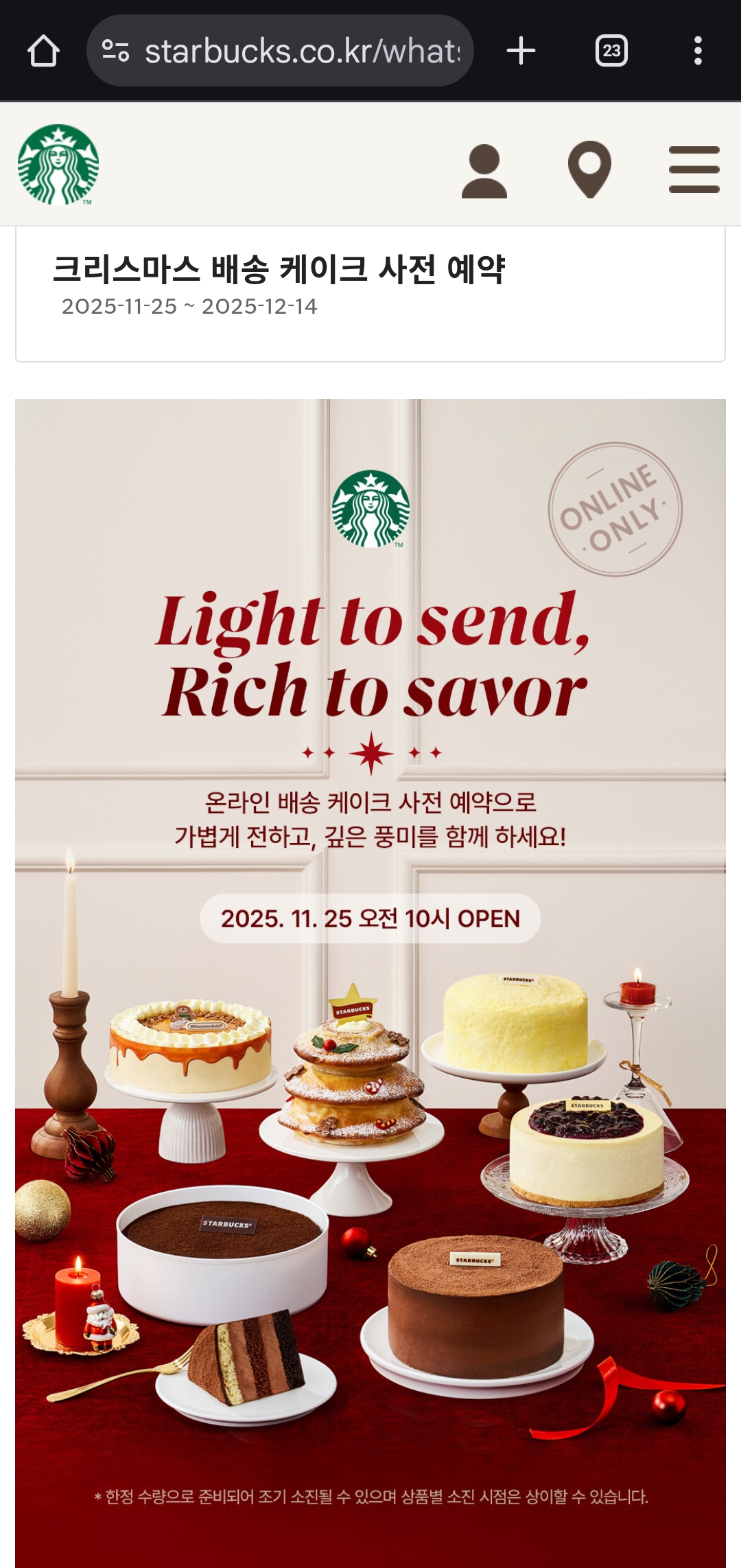 다가오는 크리스마스를 맞아 스타벅스에서 2025년 크리스마스 배송 케이크 사전예약 이벤트를 진행합니다. 올해는 온라인 전용으로, 원하는 날짜에 원하는 장소로 무료 배송까지 가능해 간편하게 크리스마스 선물과 디저트를 준비할 수 있습니다.
