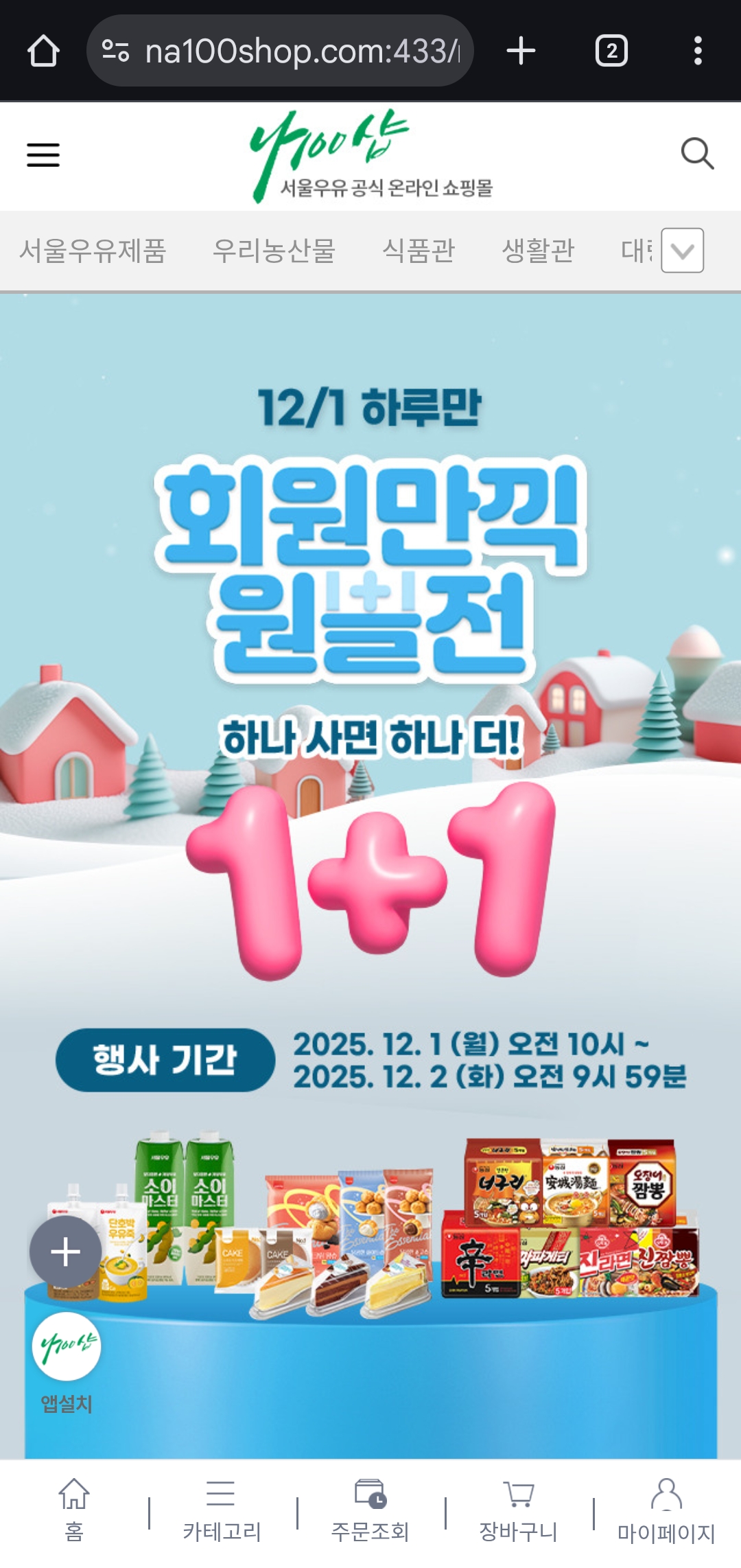 서울우유 공식몰 나100샵이 단 하루 동안 ‘1+1 원쁠전’을 열었어요.