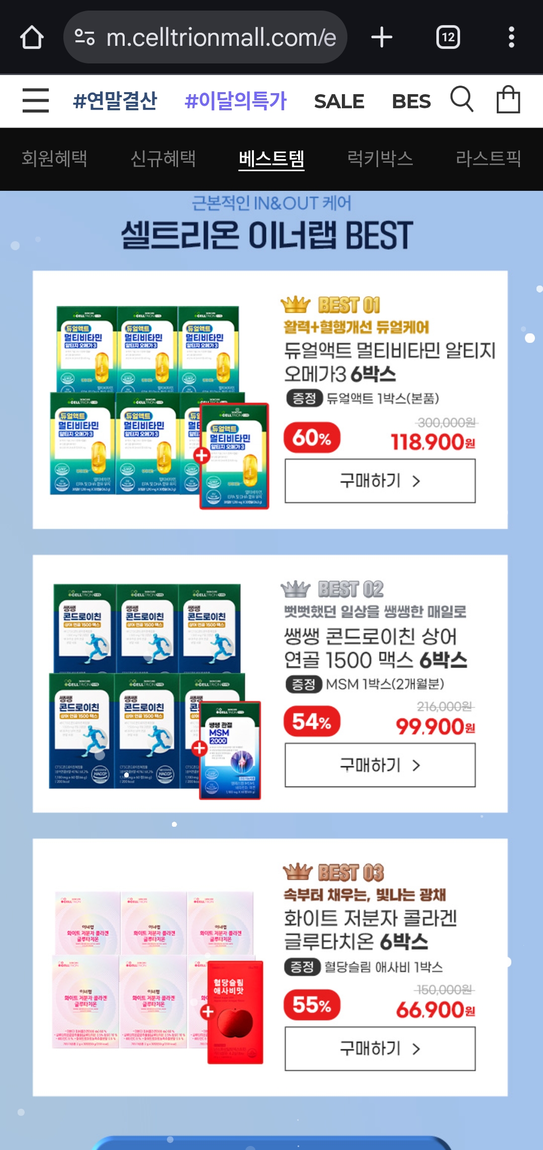 올해는 특히 셀트리온몰에서 이너랩 제품을 최대 91%까지 할인하는 역대급 연말결산 세일을 진행하고 있어요.