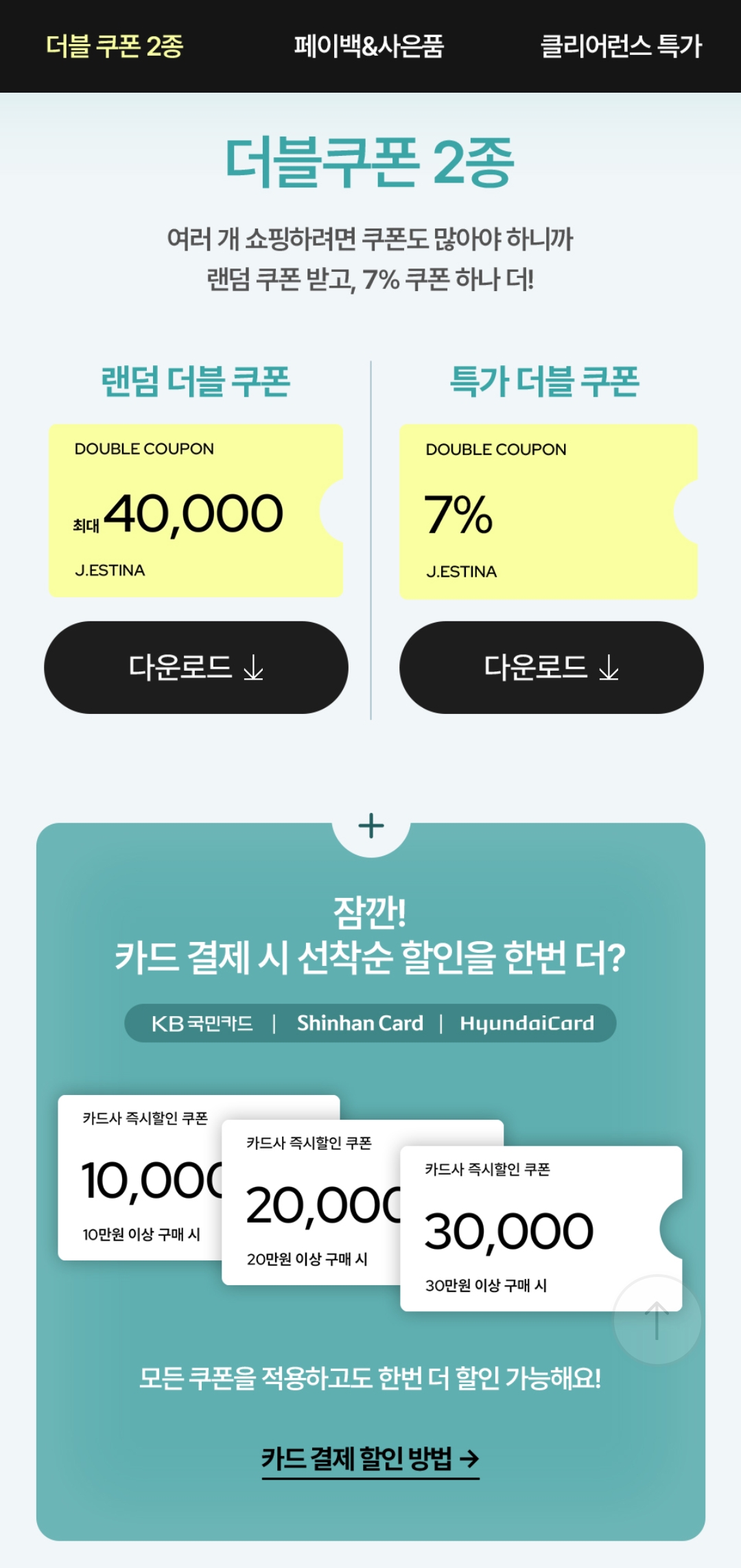# 랜덤 더블 쿠폰 + 특가 더블 쿠폰 본 더블 쿠폰은 이벤트 기간 내 쿠폰 다운로드를 누른 고객에 한 해 지급 되며, 마이페이지 쿠폰관리에서 확인 가능합니다. 본 더블 쿠폰은 25.08.17(일) 까지 사