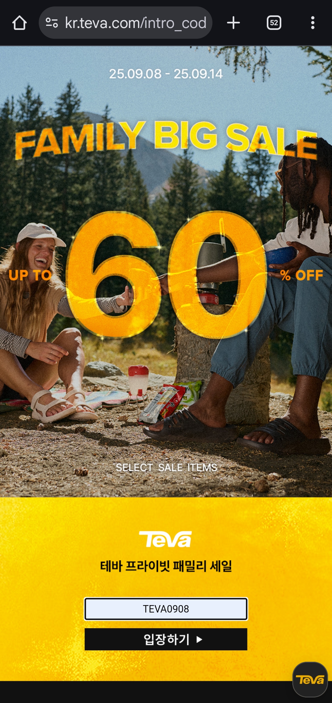 참여 방법 : 입장코드 TEVA0908 입력 후 세일 페이지 접속