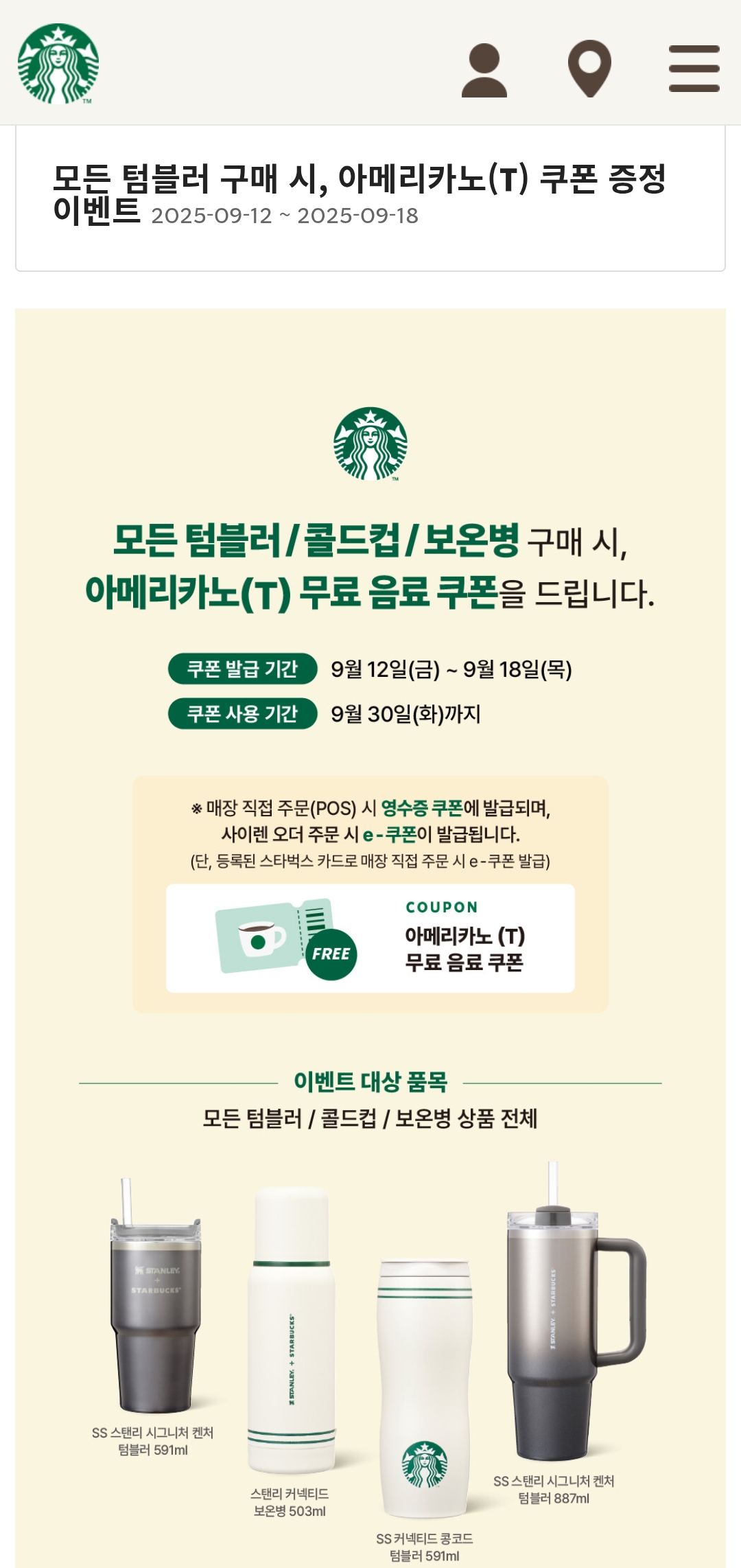 텀블러·콜드컵·보온병 1개 구매 시 → 아메리카노(T) 무료 쿠폰 1장 증정
