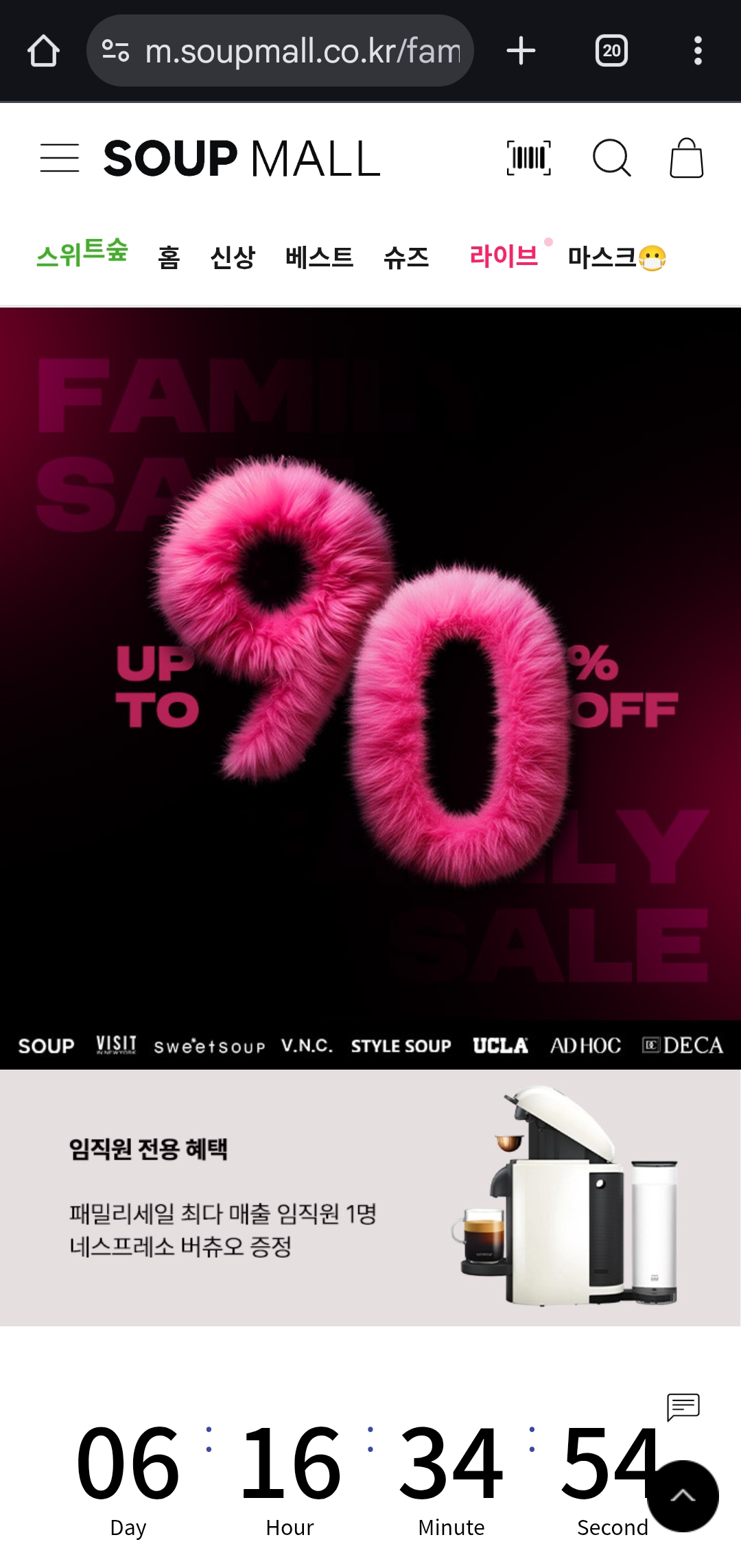 숲몰에서 SOUP, VISIT, AD HOC, UCLA 인기 브랜드의 의류를 무려 최대 90% 할인된 가격으로 만나볼 수 있는 패밀리세일을 진행하고 있어요. 합리적인 가격에 트렌디한 스타일을 완성할 절호의 기회, 놓치면 정말 아쉽겠죠?