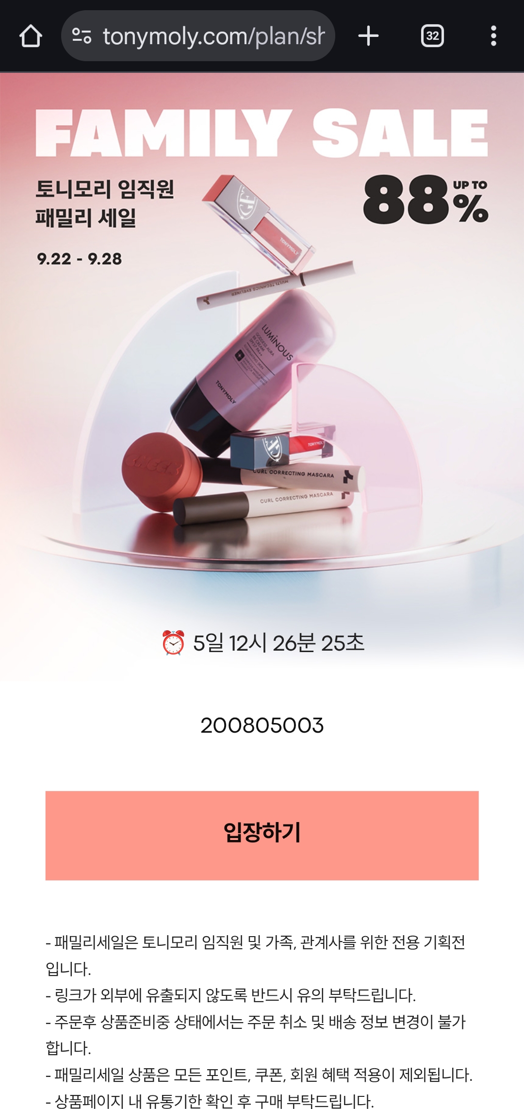 화장품을 합리적인 가격에 장만할 수 있는 이번 토니모리 임직원 패밀리세일은 한정 수량으로 진행됩니다. 입장코드 200805003을 입력하고 지금 바로 쇼핑을 시작하세요!