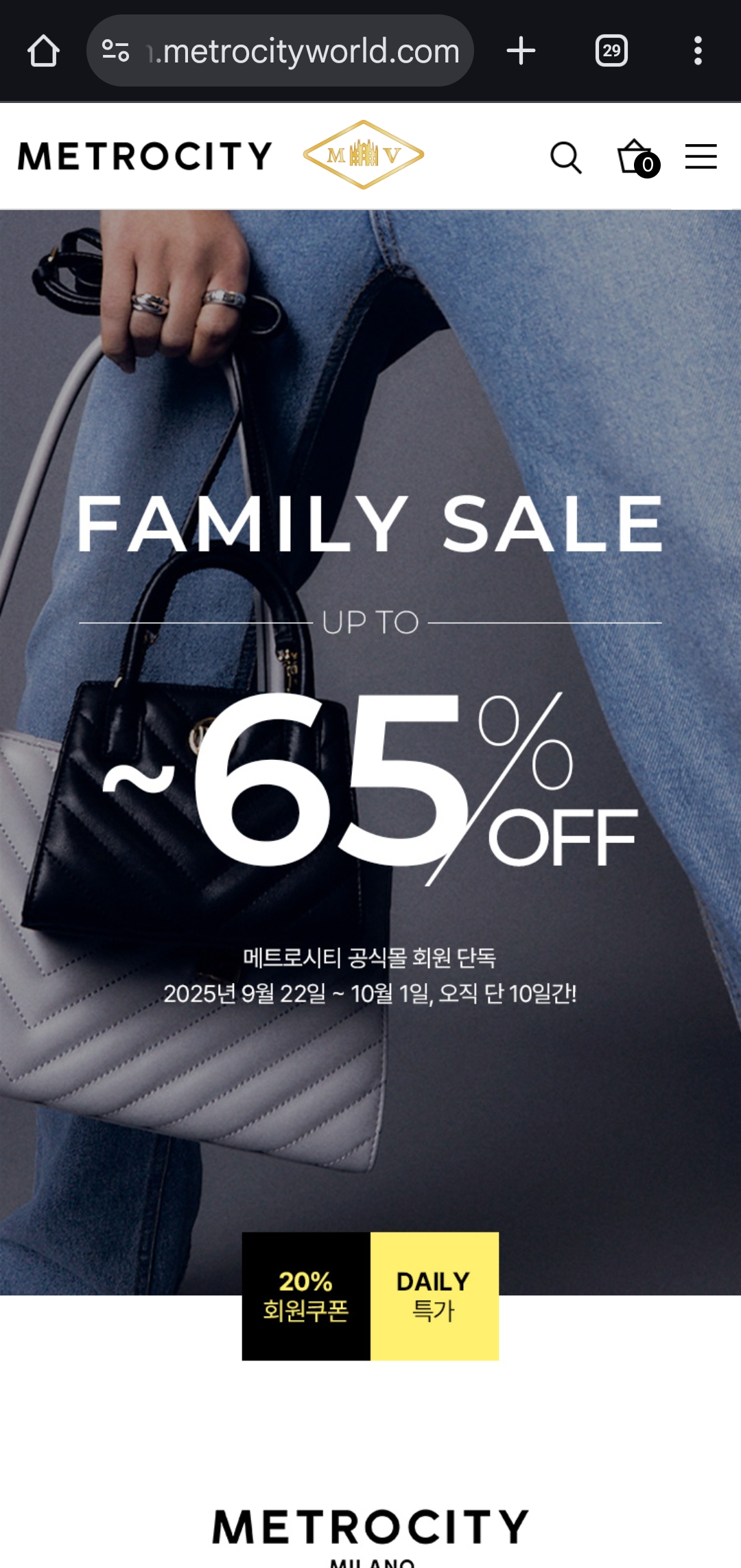 가을 스타일링을 준비하신다면 지금이 바로 기회! 메트로시티(METROCITY) 공식몰에서 악세사리, 지갑, 가방 등 인기 아이템을 최대 65% 할인하는 패밀리세일을 진행하고 있습니다. 세련된 디자인과 활용도 높은 아이템을 합리적인 가격에 만날 수 있는 절호의 찬스예요.