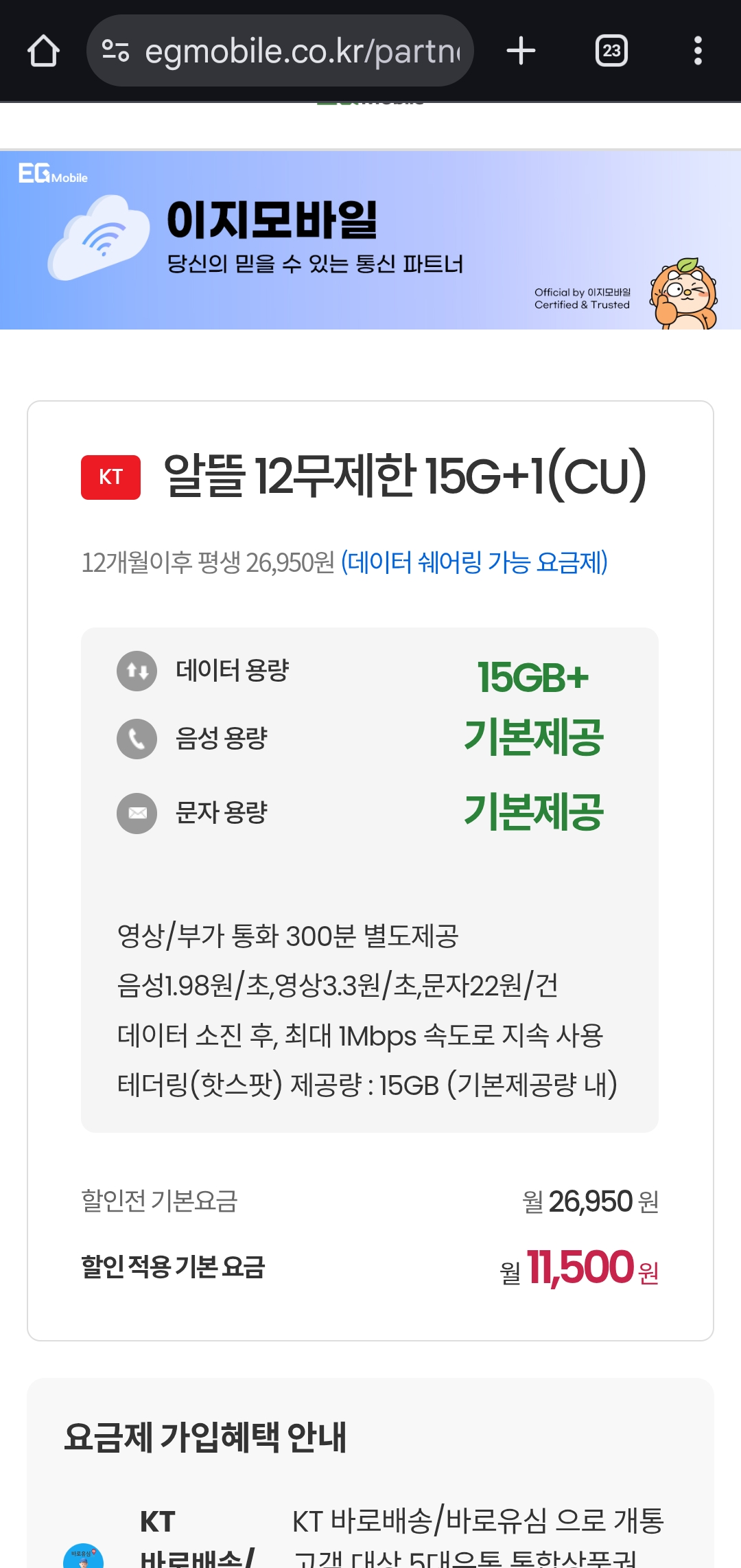 할인 적용 요금: 월 11,500원 (12개월 한정)