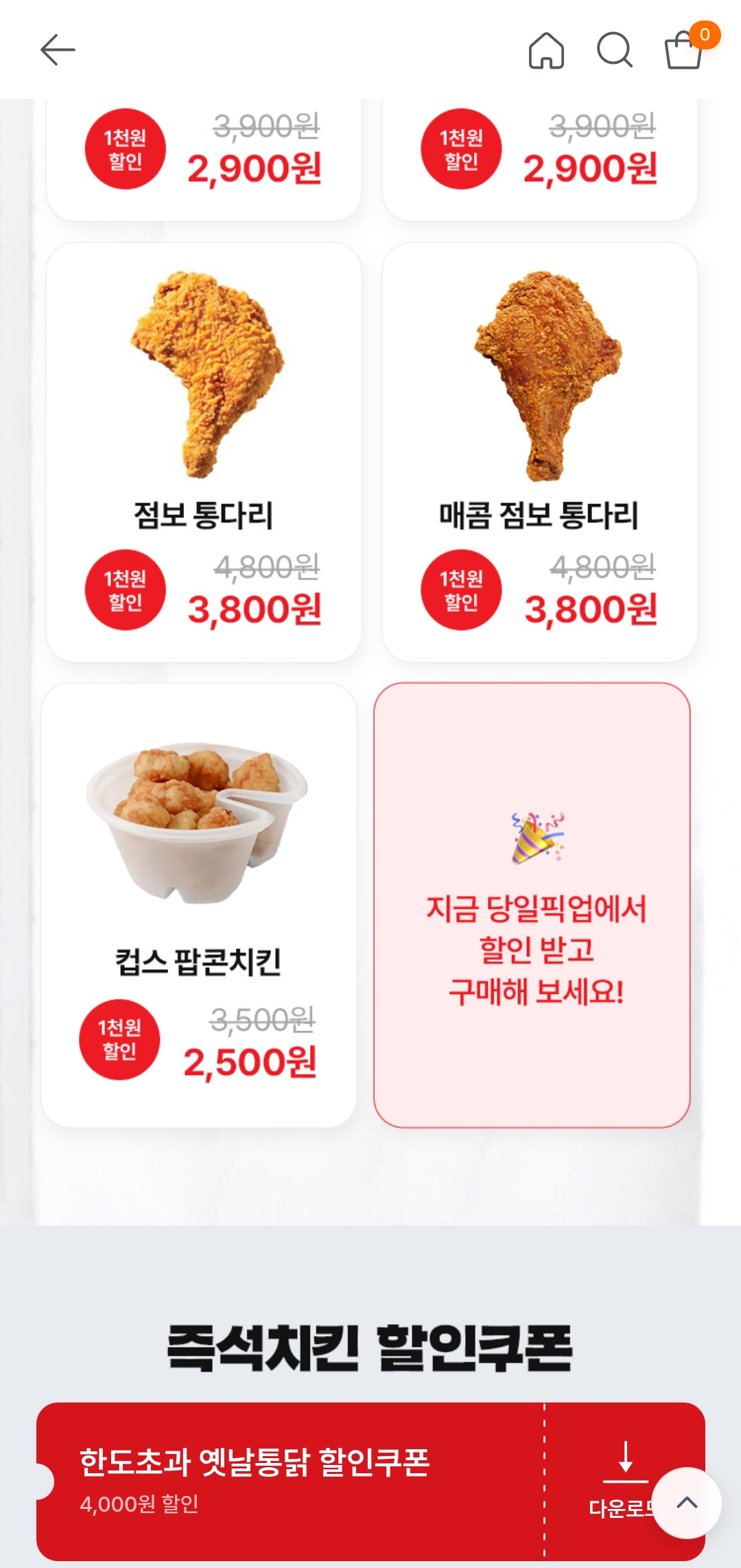 즉석치킨 9종을 대상으로 최대 4,000원 할인이 적용되는 쿠폰이 제공되고 있어요.
